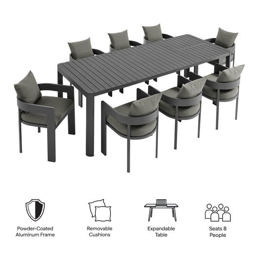 Tahoe 9-Piece Outdoor Patio Aluminum Dining Set With Extendable Table in Gray Charcoal by Modway (7295)