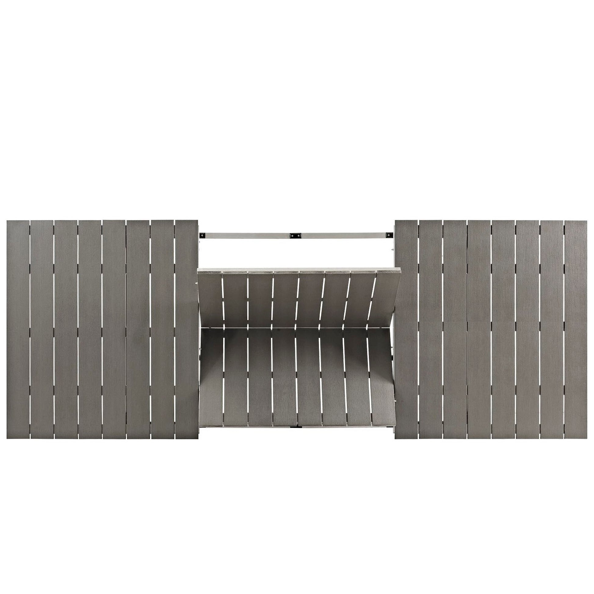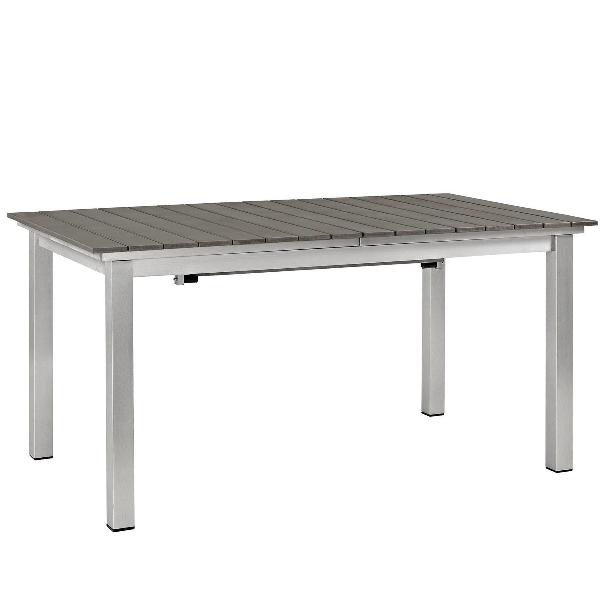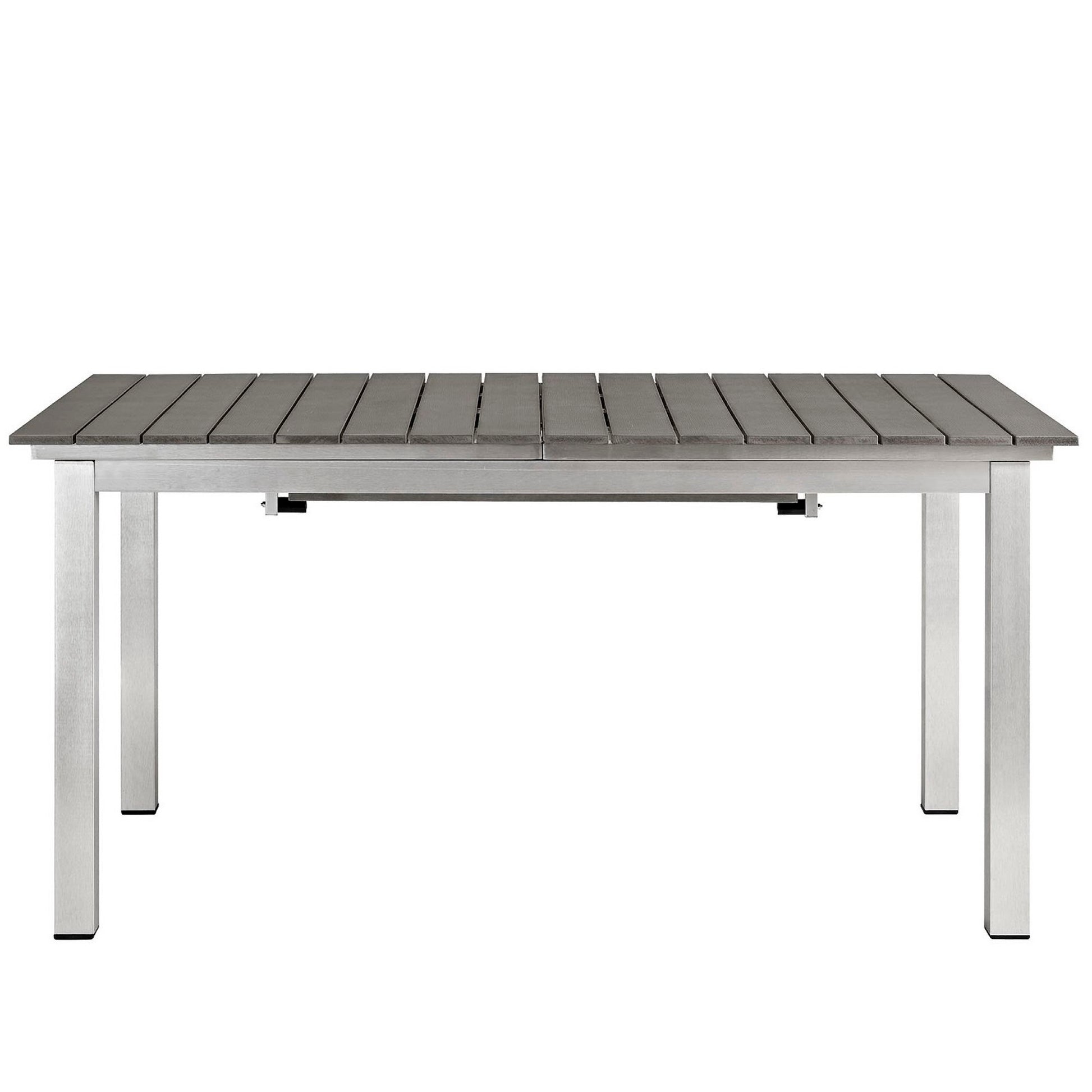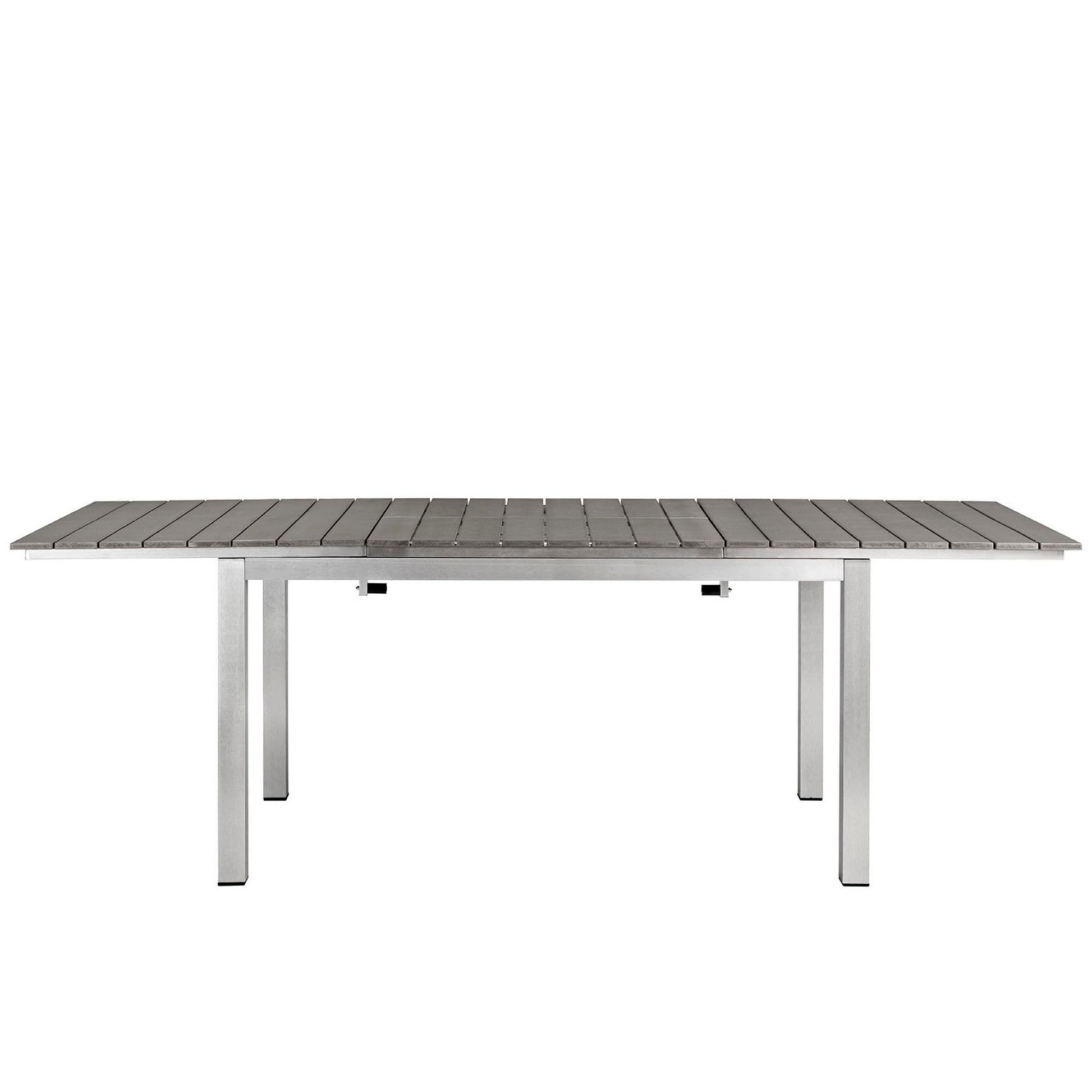 Enjoy your patio or backyard leisure time with the strong and durable Shore Outdoor Patio Aluminum Extension Dining Table. Made with an anodized brushed aluminum frame and non-marking black plastic foot caps, Shore Patio Dining Table features tone-on-tone grays with wood accents on the paneling for a chic and minimalist look. Easily collapse the center panel and fold safely underneath, or extend to full size, with the versatile Shore Outdoor Dining Table.