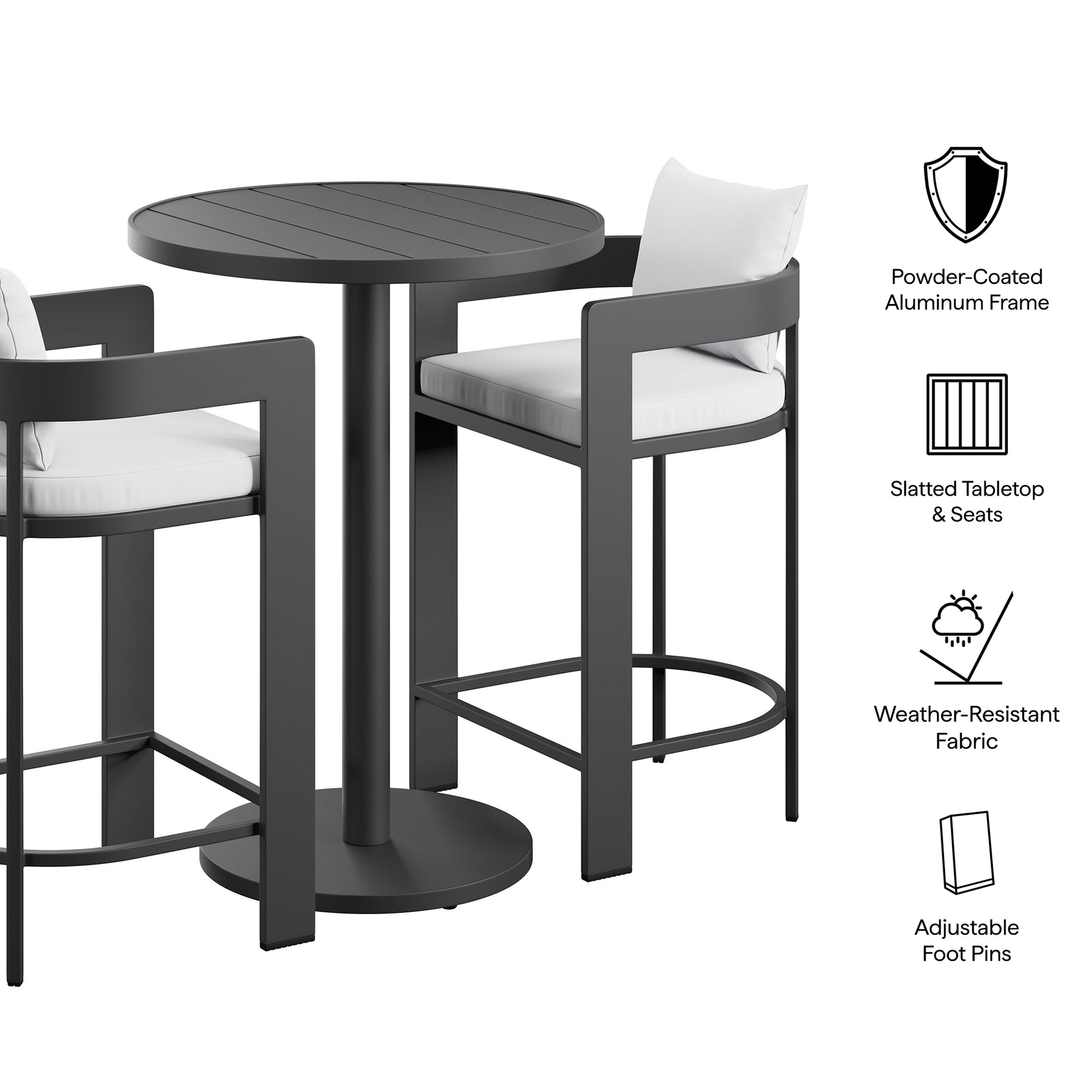Enliven your alfresco spaces with the Tahoe Outdoor Patio 3-piece Bar Set. Built with durable aluminum frames and finished in a smooth powder-coated finish, this bar table and chairs set brings a clean, modern look to outdoor spaces. The set includes one round bar-height table and two matching bar chairs for drinks, casual meals, and easy conversation. Featuring a slatted tabletop with smooth edges and coordinating slatted chair seats, Tahoe wipes down easily and stays simple to maintain. With easy assembly and adjustable plastic foot pins to help keep it level on uneven surfaces, this patio bar set for 2 is made for everyday outdoor dining. Table Weight Capacity: 177 lbs. Chair Weight Capacity: 300 lbs. Each.