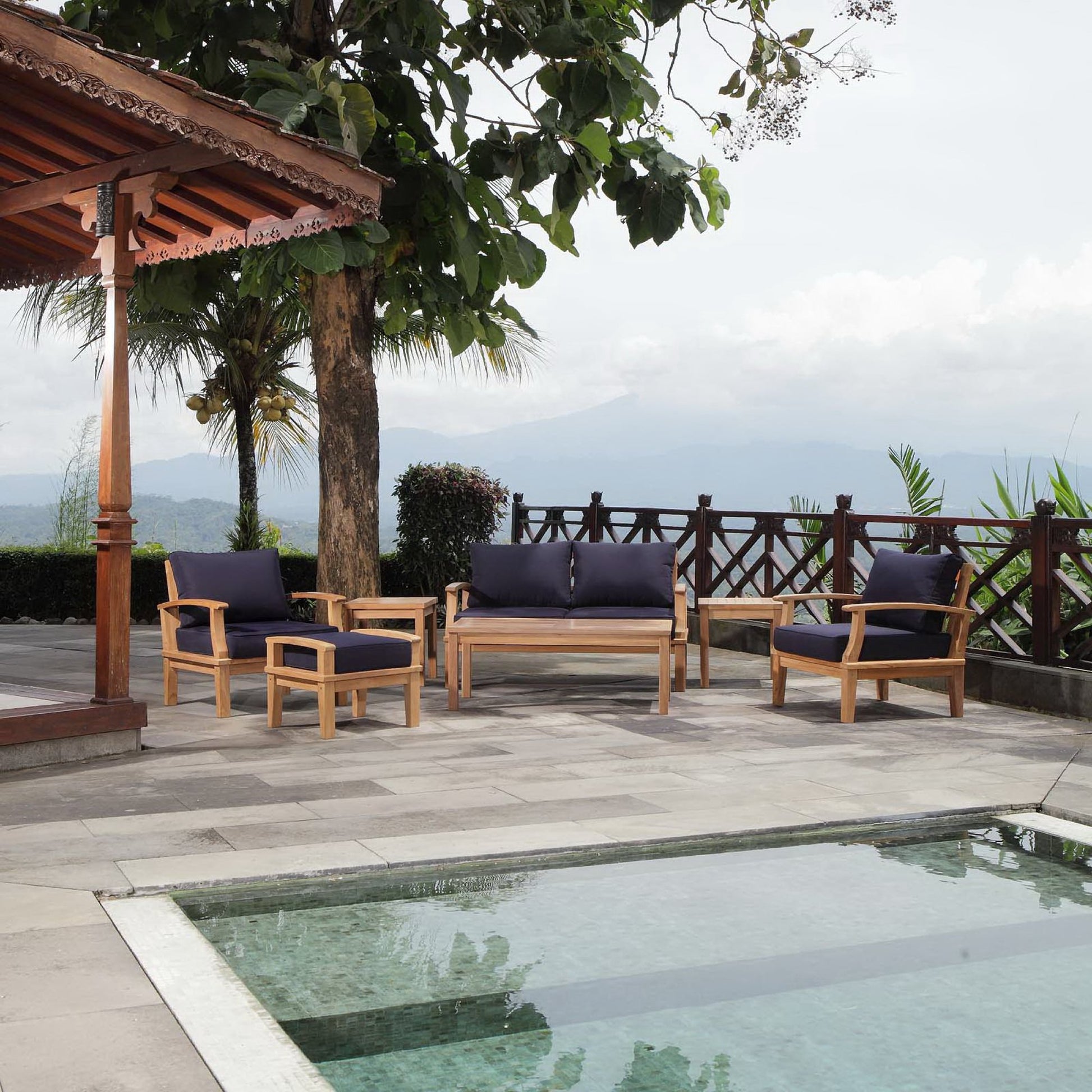 Command attention on your patio with the Marina 7-Piece Teak Furniture Set in a sophisticated Navy colorway. This comprehensive outdoor conversation set is the definitive anchor for high-end lounging, offering a perfect balance of deep-seated comfort and functional surfaces. Precision-crafted from Grade A solid teak wood, each piece showcases a richly textured grain that brings organic warmth and mid-century modern flair to your exterior decor. Teak’s legendary high oil content provides a natural armor against the elements, ensuring this collection remains a durable, rot-resistant sanctuary for years to come.