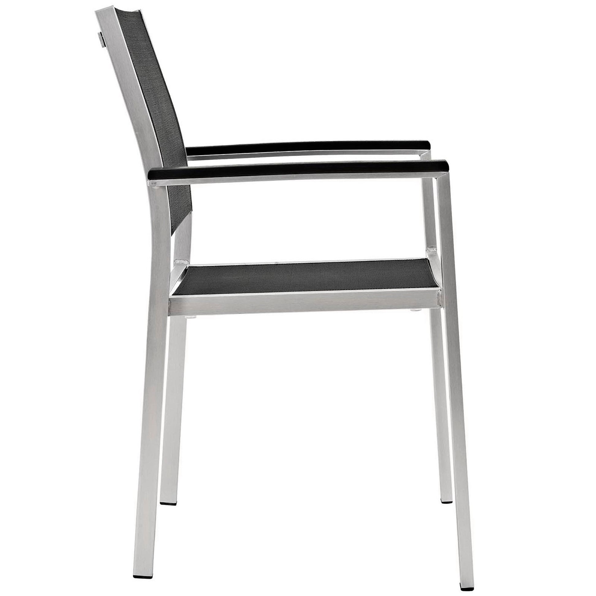 The set includes four ergonomic armchairs draped in breathable Textilene® mesh in a bold black finish. This UV-resistant fabric provides a comfortable, supportive seat that contours to the body while ensuring maximum airflow during warm summer days. Sophisticated plastic wood paneling accents the armrests and table surface, providing a warm, organic contrast to the sleek silver metal. Complete with non-marking foot caps to safeguard your flooring, this low-maintenance ensemble delivers the perfect balance of chic minimalism and functional longevity for your outdoor sanctuary.