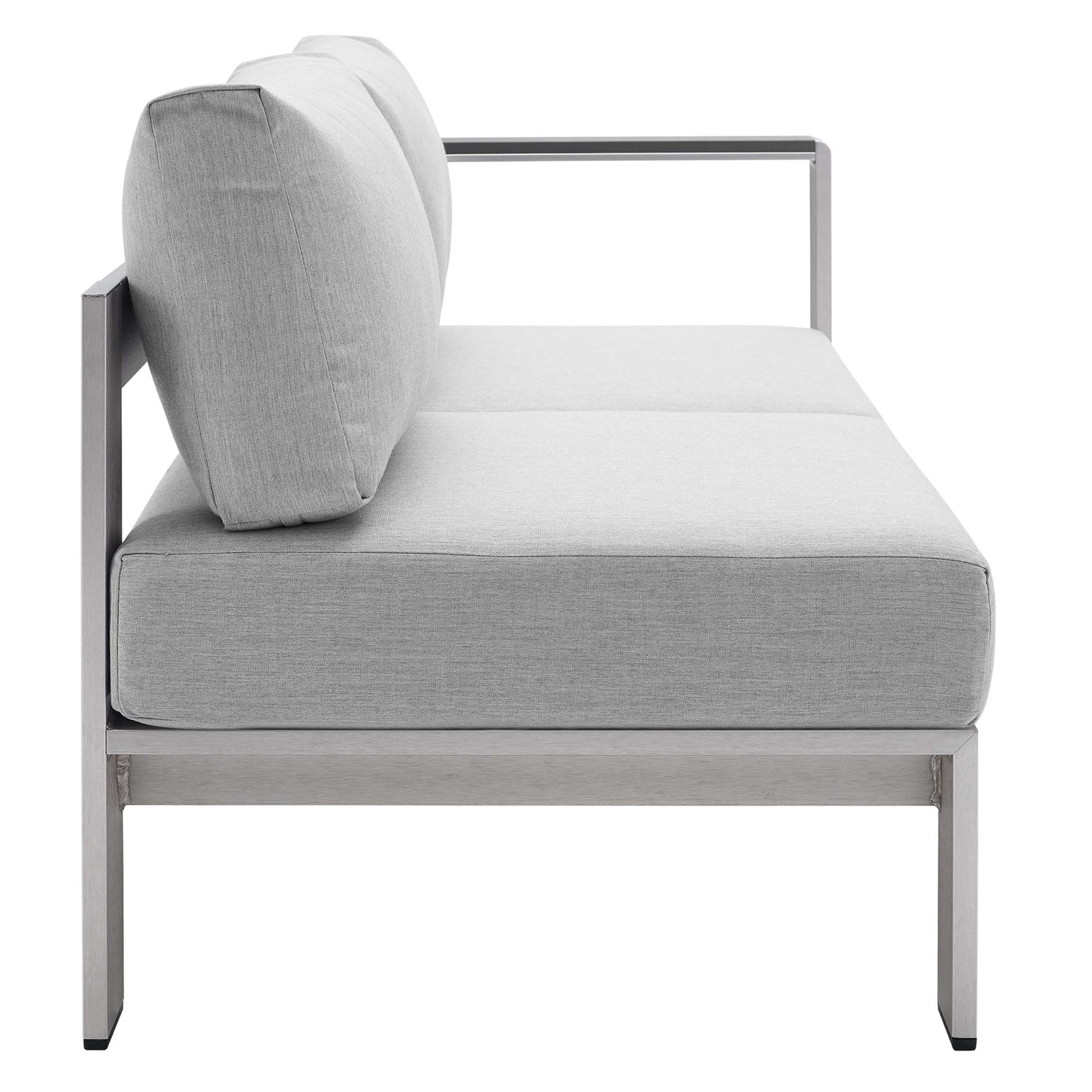 Enjoy your patio or backyard leisure time with the strong and durable Shore Outdoor Aluminum Right-Arm Loveseat. Made with an anodized brushed aluminum frame and non-marking black plastic foot caps, Shore comes outfitted with resilient Sunbrella fabric canvas cushions tested to last through all weather conditions. The Shore Outdoor Aluminum Right-Arm Corner Sectional Loveseat complements your casual gatherings with a look and functionality you can rely on.
