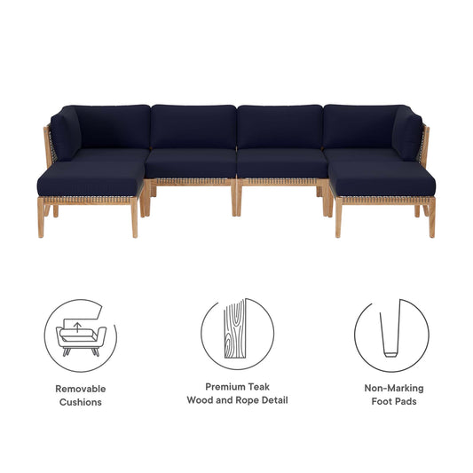 Clearwater 6-Piece Outdoor Patio Teak Wood Sectional Sofa in Gray Navy by Modway (6122)